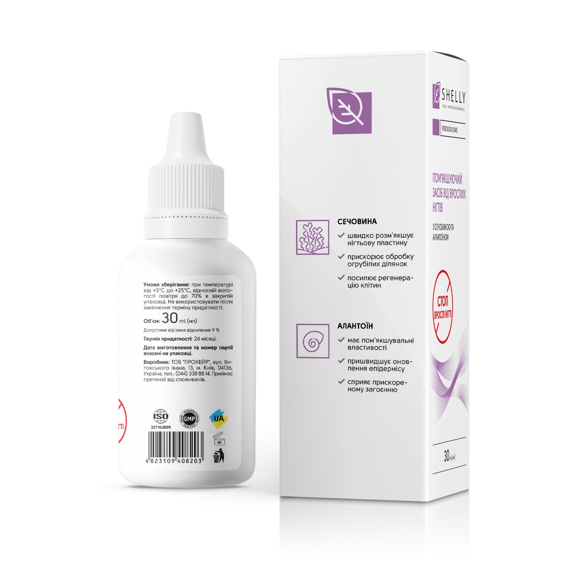 Професійний засіб Shelly™ розроблений для пом'якшення потовщеної нігтьової пластини та грубих валиків шкіри навколо врослих нігтів. Рідина сприяє полегшенню безболісного обрізання нігтів, що вросли. Активні компоненти мають відновлювальні та зволожувальні властивості, пришвидшують загоєння пошкоджених ділянок, посилюють регенерацію клітин. Засіб допомагає зробити подальший догляд за нігтями більш комфортним. Підходить для професійного та домашнього використання.