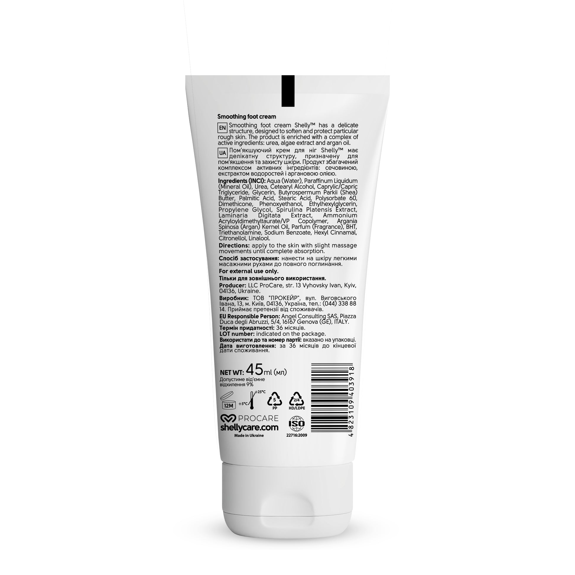 Крем ТМ Shelly має ніжну структуру та легкий аромат. 5% вміст сечовини забезпечує пом'якшувальний ефект, а також допомагає корисним елементам глибокого проникати у роговий шар епідермісу. Завдяки екстракту водоростей клітини шкіри надовго утримують вологу, не дозволяючи їй випаровуватися. Арганова олія запобігає утворенню тріщин та покращує здатність шкіри до відновлення.